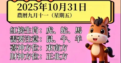 明日小運播報~2025 年 10 月 31 日(星期五)農曆九月十一
